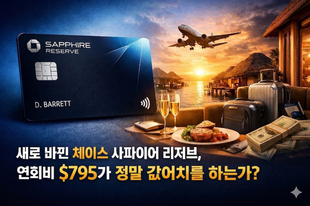 체이스 사파이어 리저브는 “프리미엄 여행 카드"의 기준이 되는 카드이다. 종전의 $450(2016), $550(2020)의 연회비에서 이제는 $795(6/2025)로 바뀌면서 분위기가 완전히 달라졌다. 예전의 카드가 여행카드였다면 새로 바뀐 카드는 여행, 다이닝, 엔터테인먼트와 구독형 혜택이 대폭 추가된 다목적 카드가 되었다. 현재 공개된 핵심 구조는 $795 연회비, 추가 사용자 카드 $195, $300 연간 트래블 크레딧, The Edit 최대 $500 크레딧, Chase Sapphire Lounge 및 Priority Pass 라운지 이용, OpenTable 다이닝 크레딧, DoorDash/StubHub/Lyft/Peloton/Apple 서비스 관련 혜택 등으로 바뀌어 있다. 적립 구조도 강화되어 Chase Travel은 8배, 직접 예약 항공권 구매는 4배, 직접 예약 호텔 구매는 4배, 전 세계 다이닝은 3배, 그리고 기타 구매에는 1배가 적용된다.