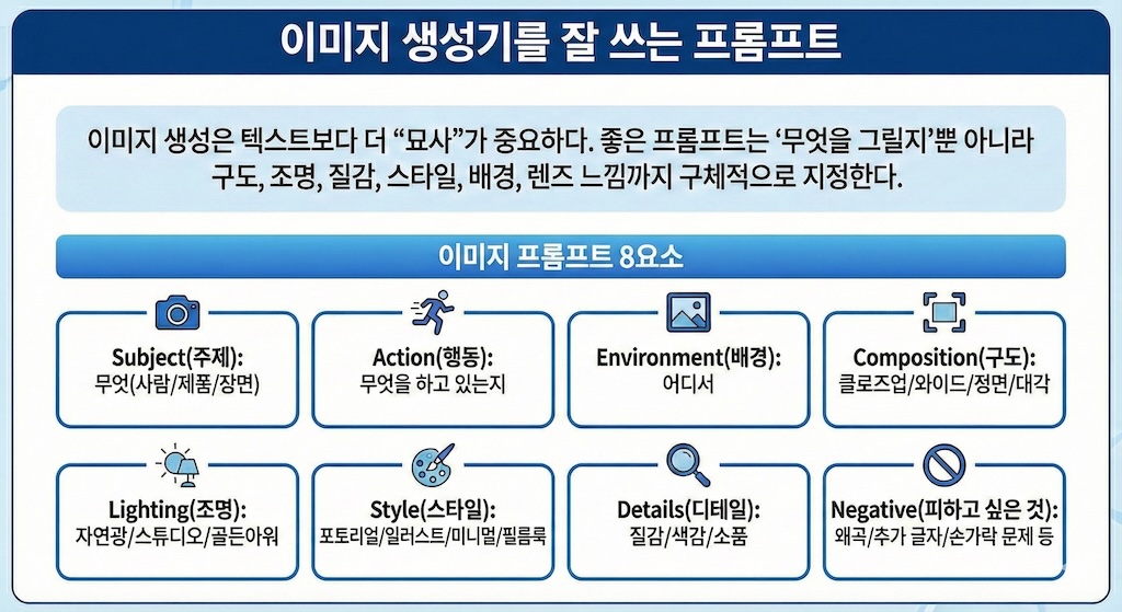 이미지 생성은 텍스트보다 더 “묘사”가 중요하다. 좋은 프롬프트는 ‘무엇을 그릴지’뿐 아니라 구도, 조명, 질감, 스타일, 배경, 렌즈 느낌까지 구체적으로 지정한다.